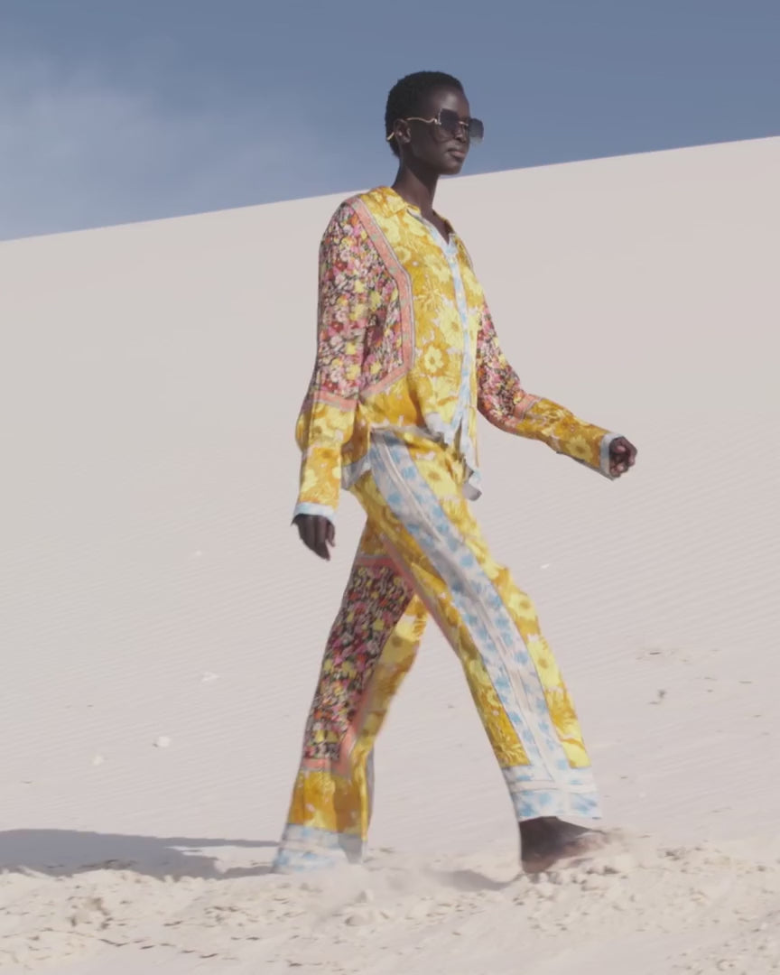 The sunflower yellow floral print comes to life with contrasting blue stripes running down the legs and at the hem, adding a graphic and contemporary touch.